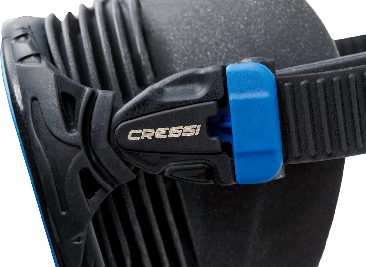 The buckles are integrated with the frame with a swivel system that are easy-to-use for quick strap length adjustment. This technology is patented by Cressi (US 8281417 B2).