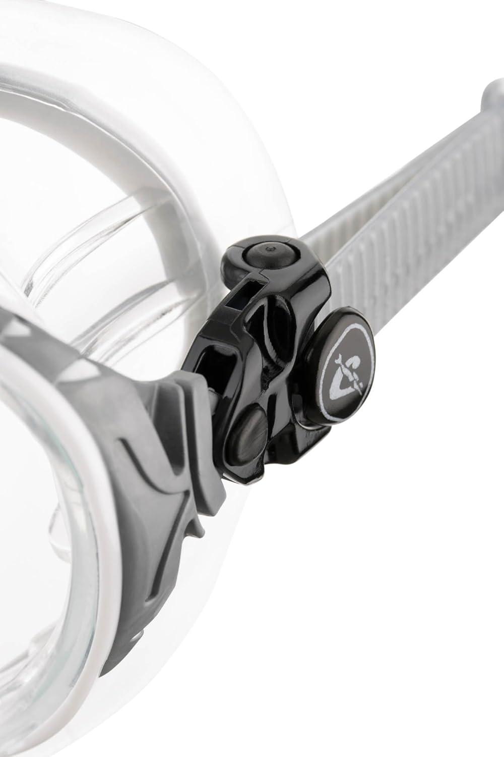 Not only has this new High Seal silicone been chosen, with its exceptional softness and comfort, but the entire design of the skirt has followed new rules which allow a point of contact between the mask and the face that has a very open angle.The mask rests on the face with unprecedented comfort and does not leave any marks on the skin, even after extended use.Naturally, to obtain such a result the entire structure of the skirt is differentiated, with internal ribs that stiffen the parts of the mask that are most stressed.The raked lenses(Cressi patent), are quite small and are brought as close to the pupils as possible, so that the already extraordinary visibility of the Matrix is increased by 25%.The headband uses the exclusive patented Cressi system of double injection of an elastomer on a rigid element and allows the buckles of the strap to be mounted not on the skirt structure, as done by our competitors, but on an indestructible elastic element that tilts on a vertical plane and can be completely bent sideways on a 180 curve.The thickness of the headband has been reduced to such an extent as to make it practically invisible when the mask is being worn.