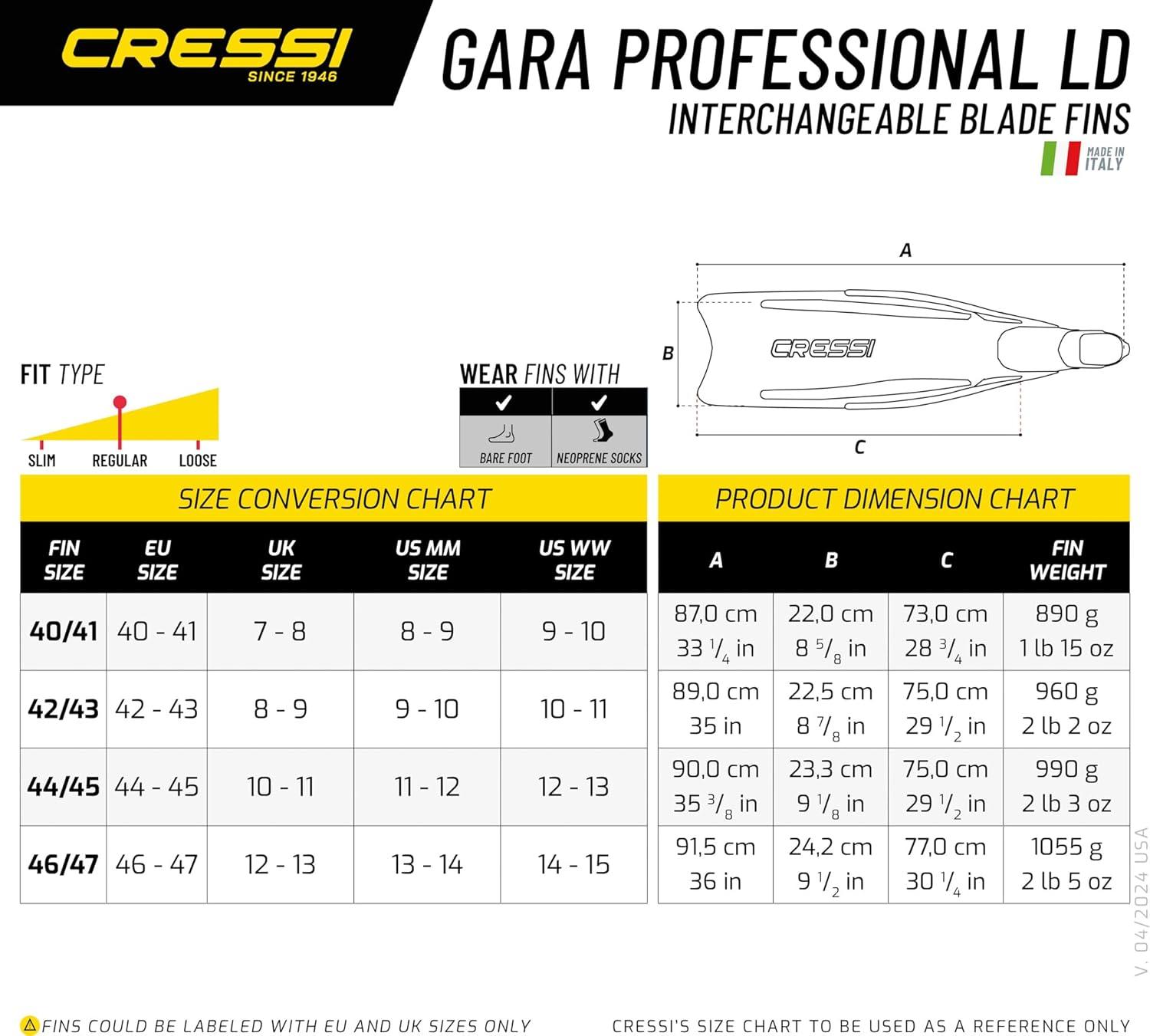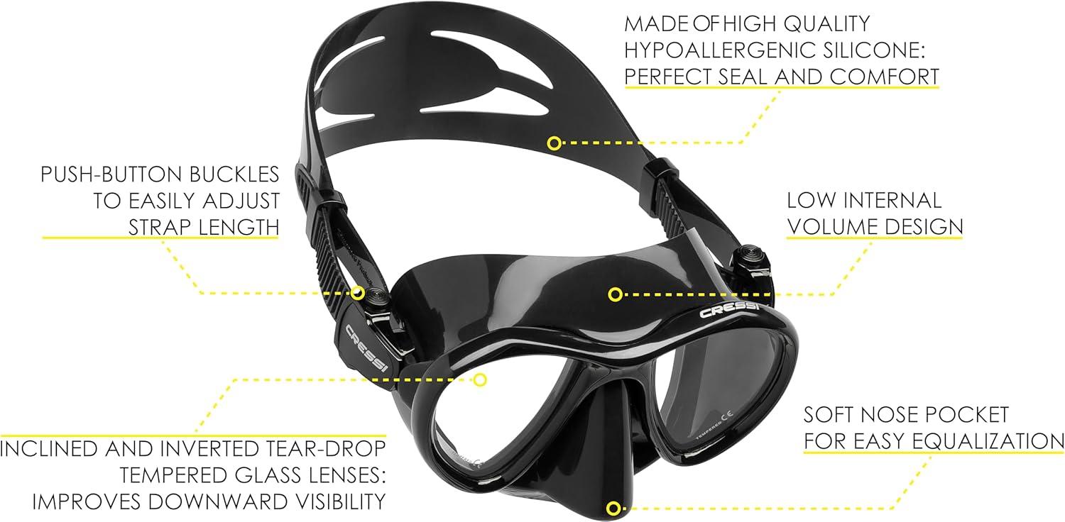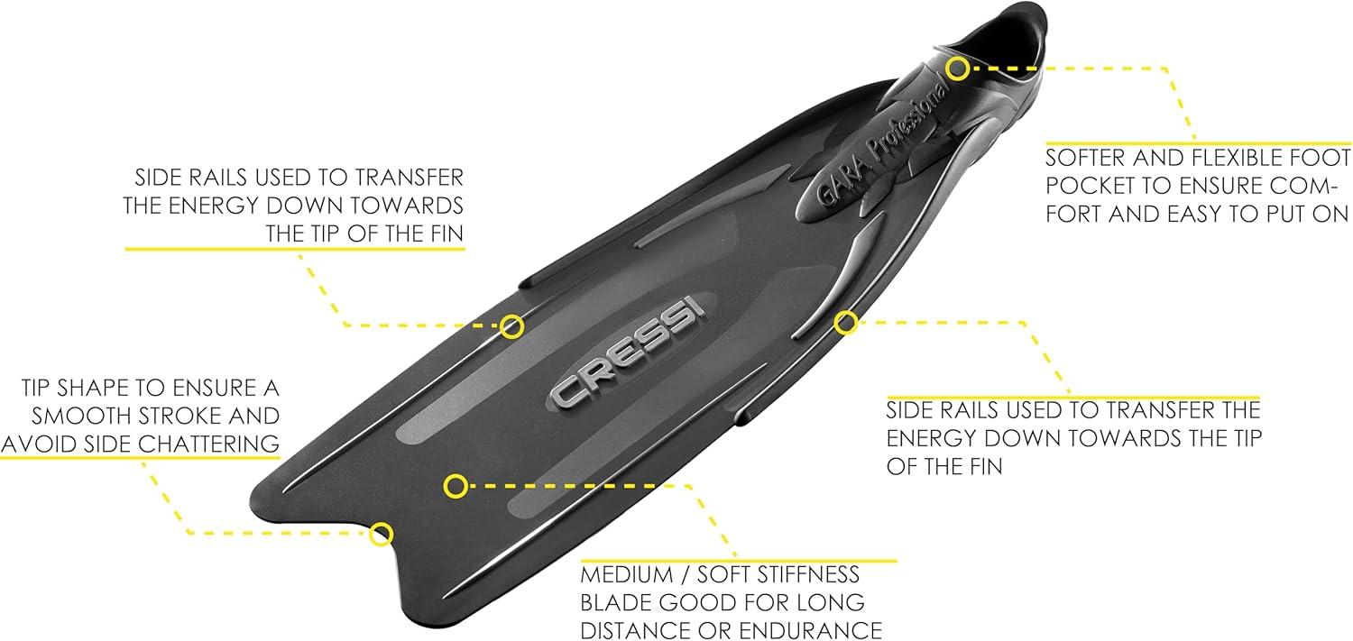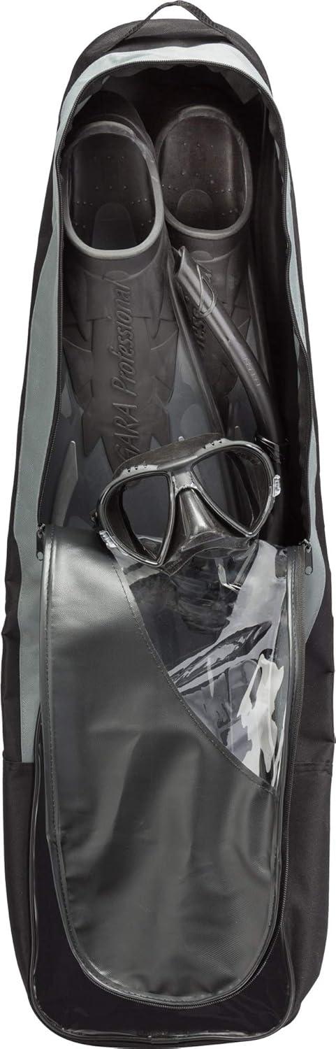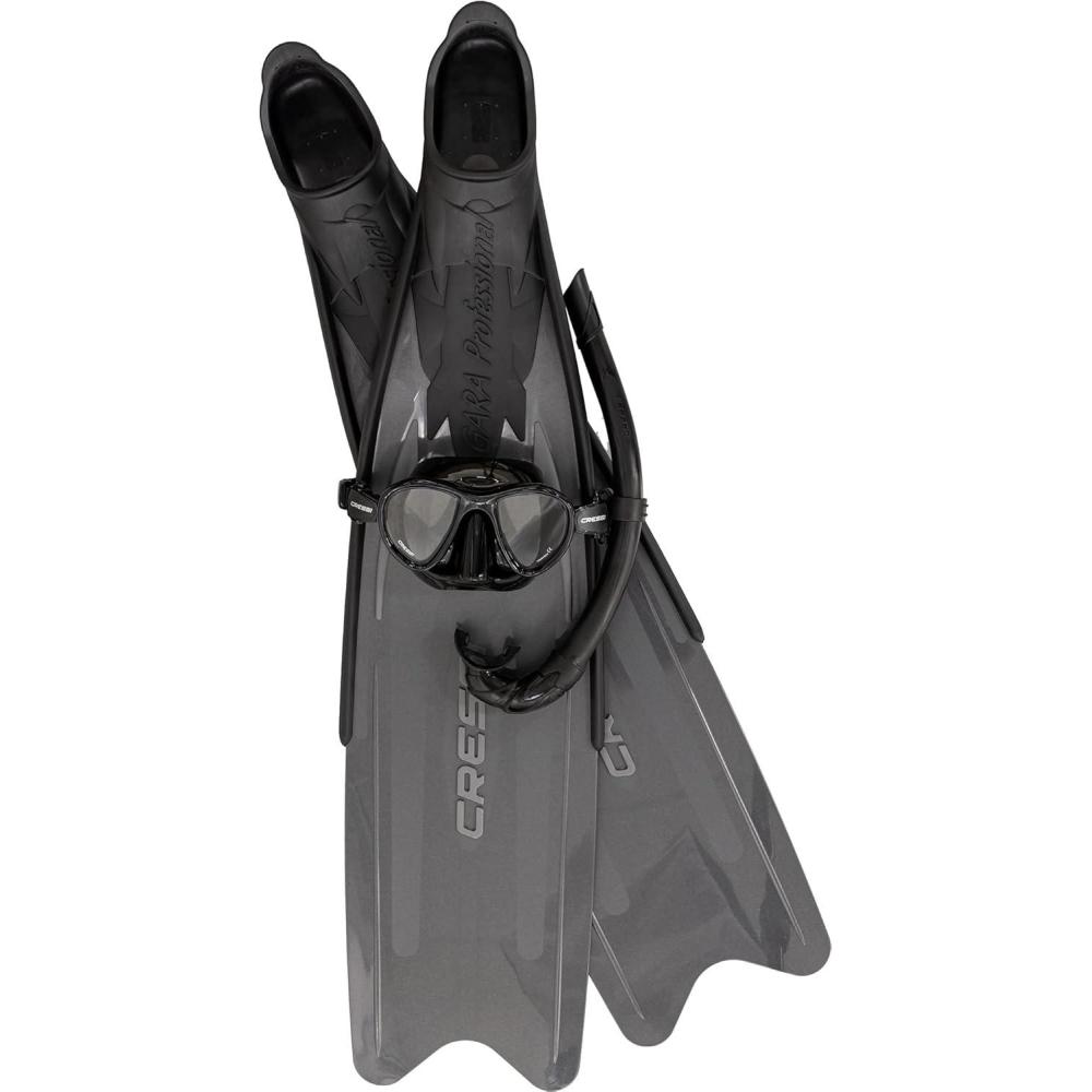 Cressi made this set composed by professional items, of high quality and performance, to give the opportunity to use a high standard equipment for free diving and for spearfishing. The set is composed by the Matrix mask, the Gara Professional LD fins, the Corsica snorkel. Included in the set there are the Mask Strap Cover and the Antifog Solution. The Long Fins Set Bag allows to carry all the set and other personal equipment. The Gara Professional LD is a high performance fin and requires minimum effort to load the long blades and is an excellent choice for deep freediving and spearfishing, yet are more forgiving than other long blade fins for the untrained legs. It is ideal for long distance swimming or for beginners not previously used to using a long blade fin, but can provide the power and efficiency for any experience level while deep freediving and spearing. Due to the multi compound bonding process used during the manufacturing process, the Gara Pro LD is an exceptionally soft full footpocket style fin, which provides comfort during prolonged use on those long days in the water. Gara Pro LD delivers maximum power with minimum energy through its long firm blade that runs over the footpocket. Can comfortably be worn with or without neoprene socks. The compact twin-lens Matrix takes the basic design concepts of the Big Eyes Evolution and pushes them to a new level of performance. More pronounced inverted tear-drop shaped lenses, raked inward to sit even closer to the eyes, and a more compact build overall make the Matrix an ideal choice for divers and free divers looking for the biggest view in the smallest package. The raked lenses provide excellent field-of-view. It has a low internal volume ideal for freediving. The Corsica features an ultra flexible tube.The large diameter tube provides unobstructed ease of breathing. The anatomical hypoallergenic silicone mouthpiece provides extreme comfort during prolonged use. The Long Fins Set Bag is a functional bag with the necessary space to store fins, mask and snorkel. Also longer fins such as Gara are accommodate easily in this shoulder bag for comfortable and secure transportation. Bag is made from durable nylon material. The black Mask Strap Cover is made in quality Neoprene and allows a better comfort when wearing mask, especially for long hairs. The Antifog Solution can be use in special weather and sea conditions too avoid foggy lenses. The Cressi Matrix, Gara Professional LD and the Corsica are made in Italy by Cressi's manufactory.