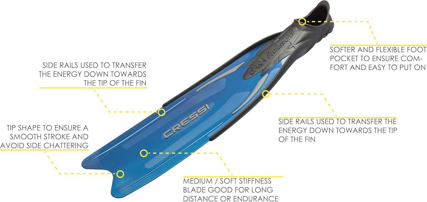 Cressi made this set composed by professional items, of high quality and performance, to give the opportunity to use a high standard equipment for free diving and for spearfishing. The set is composed by the Matrix mask, the Gara Professional LD fins, the Corsica snorkel. Included in the set there are the Mask Strap Cover and the Antifog Solution. The Long Fins Set Bag allows to carry all the set and other personal equipment. The Gara Professional LD is a high performance fin and requires minimum effort to load the long blades and is an excellent choice for deep freediving and spearfishing, yet are more forgiving than other long blade fins for the untrained legs. It is ideal for long distance swimming or for beginners not previously used to using a long blade fin, but can provide the power and efficiency for any experience level while deep freediving and spearing. Due to the multi compound bonding process used during the manufacturing process, the Gara Pro LD is an exceptionally soft full footpocket style fin, which provides comfort during prolonged use on those long days in the water. Gara Pro LD delivers maximum power with minimum energy through its long firm blade that runs over the footpocket. Can comfortably be worn with or without neoprene socks. The compact twin-lens Matrix takes the basic design concepts of the Big Eyes Evolution and pushes them to a new level of performance. More pronounced inverted tear-drop shaped lenses, raked inward to sit even closer to the eyes, and a more compact build overall make the Matrix an ideal choice for divers and free divers looking for the biggest view in the smallest package. The raked lenses provide excellent field-of-view. It has a low internal volume ideal for freediving. The Corsica features an ultra flexible tube.The large diameter tube provides unobstructed ease of breathing. The anatomical hypoallergenic silicone mouthpiece provides extreme comfort during prolonged use. The Long Fins Set Bag is a functional bag with the necessary space to store fins, mask and snorkel. Also longer fins such as Gara are accommodate easily in this shoulder bag for comfortable and secure transportation. Bag is made from durable nylon material. The black Mask Strap Cover is made in quality Neoprene and allows a better comfort when wearing mask, especially for long hairs. The Antifog Solution can be use in special weather and sea conditions too avoid foggy lenses. The Cressi Matrix, Gara Professional LD and the Corsica are made in Italy by Cressi's manufactory.