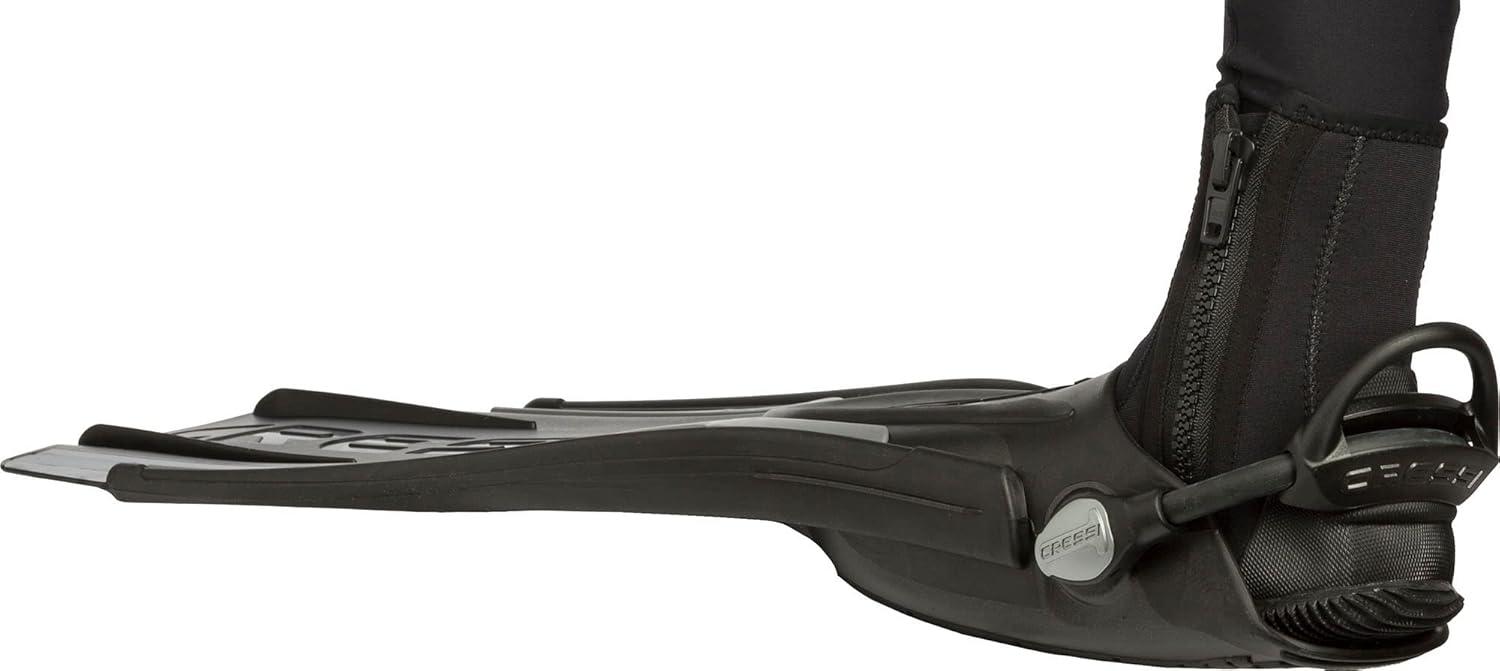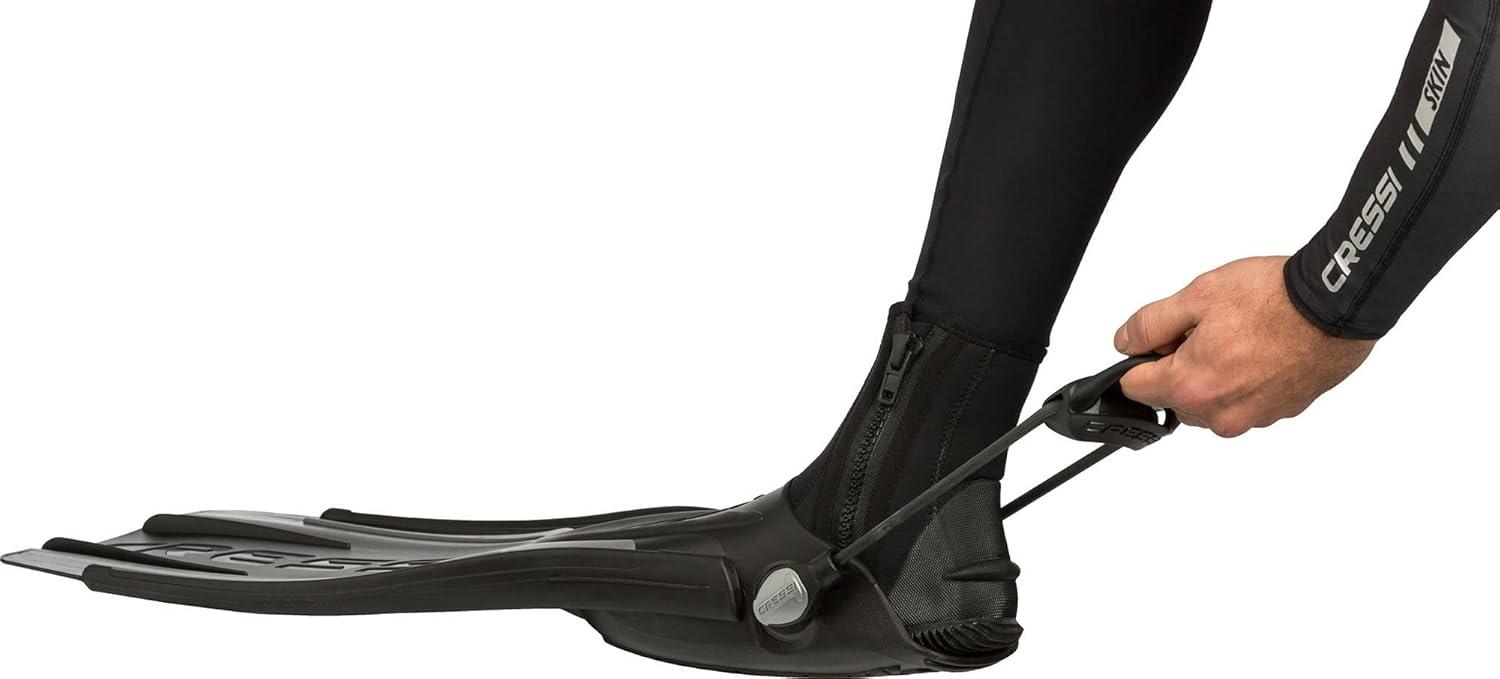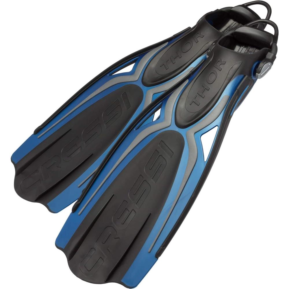 Brand new design for this extremely effective and yet very easy to use fin. The special arched profile of the fin, combined with the two central ribs promote a significant flow convection effect, known as “spoon effect”, which stabilizes and boosts propulsion. Two lateral holes discharge the negative forces typically associated with this area and at the same time make for enhanced stability. The blades are molded from two different materials for improved reactivity.These fins are perfect for scuba diving, whether you are an experienced diver or a novice. The Thor is made with the exclusive 3-material injection system patented by Cressi, which provides an excellent combination of strength, power, comfort, and aesthetics. Fins come equipped with Cressi's Elastic Bungee System (EBS) which makes use of a round bungee cord band that accommodates all foot sizes for a perfect fit. The EBS strap features an anti-corrosive rubber coated bungee, and an extra-large heel grab loop. This allows for donning and doffing even with thick diving gloves. The best feature of the bungee design is that it will always stay conformed to your foot no matter your depth by counteracting the neoprene compression of your boots. The EBS strap is guaranteed to give you unparalleled comfort and forget-about-it-adjusting. Under blade foot pocket design provides fast transmission of applied energy and great structural rigidity. Fins are available in multiple sizes and colors.