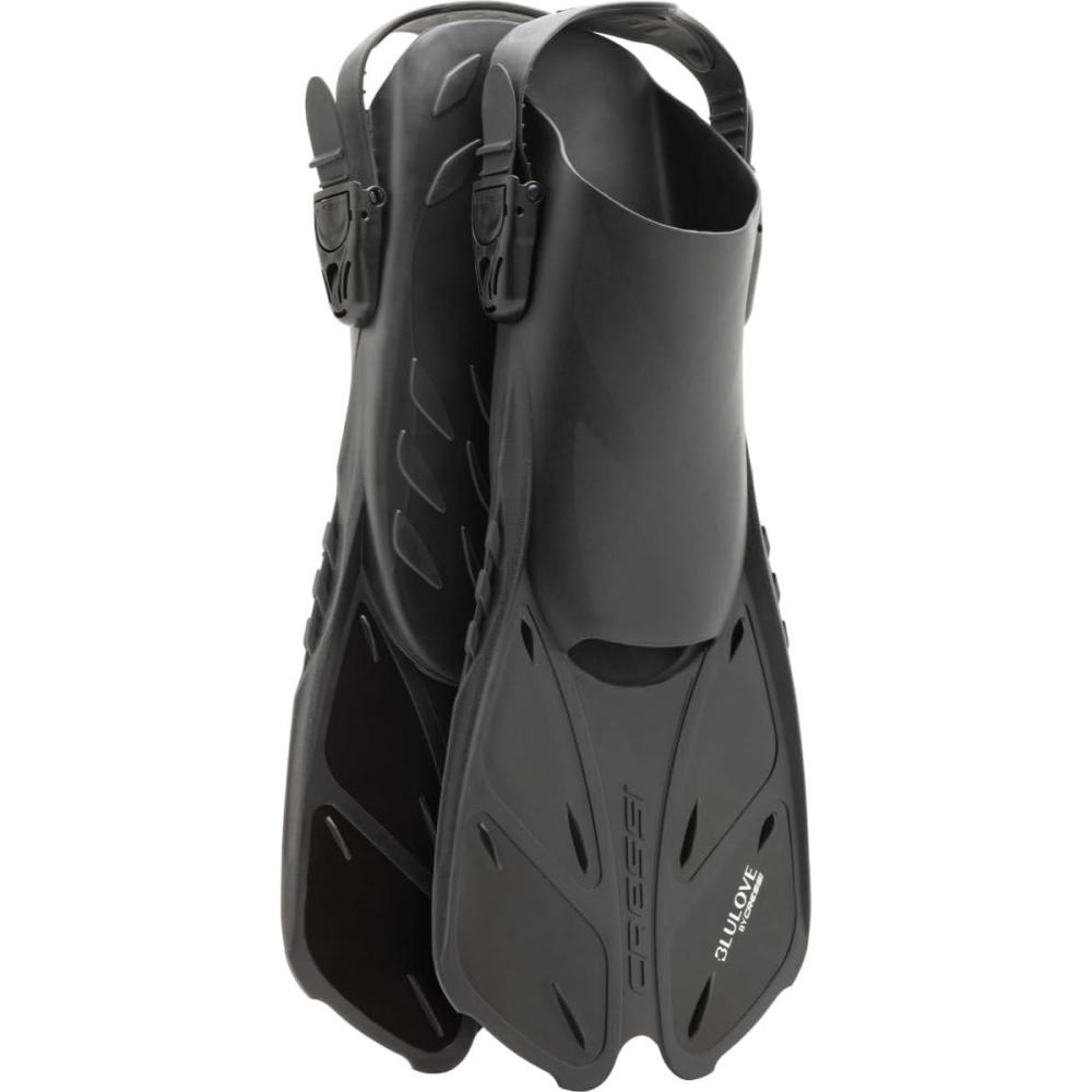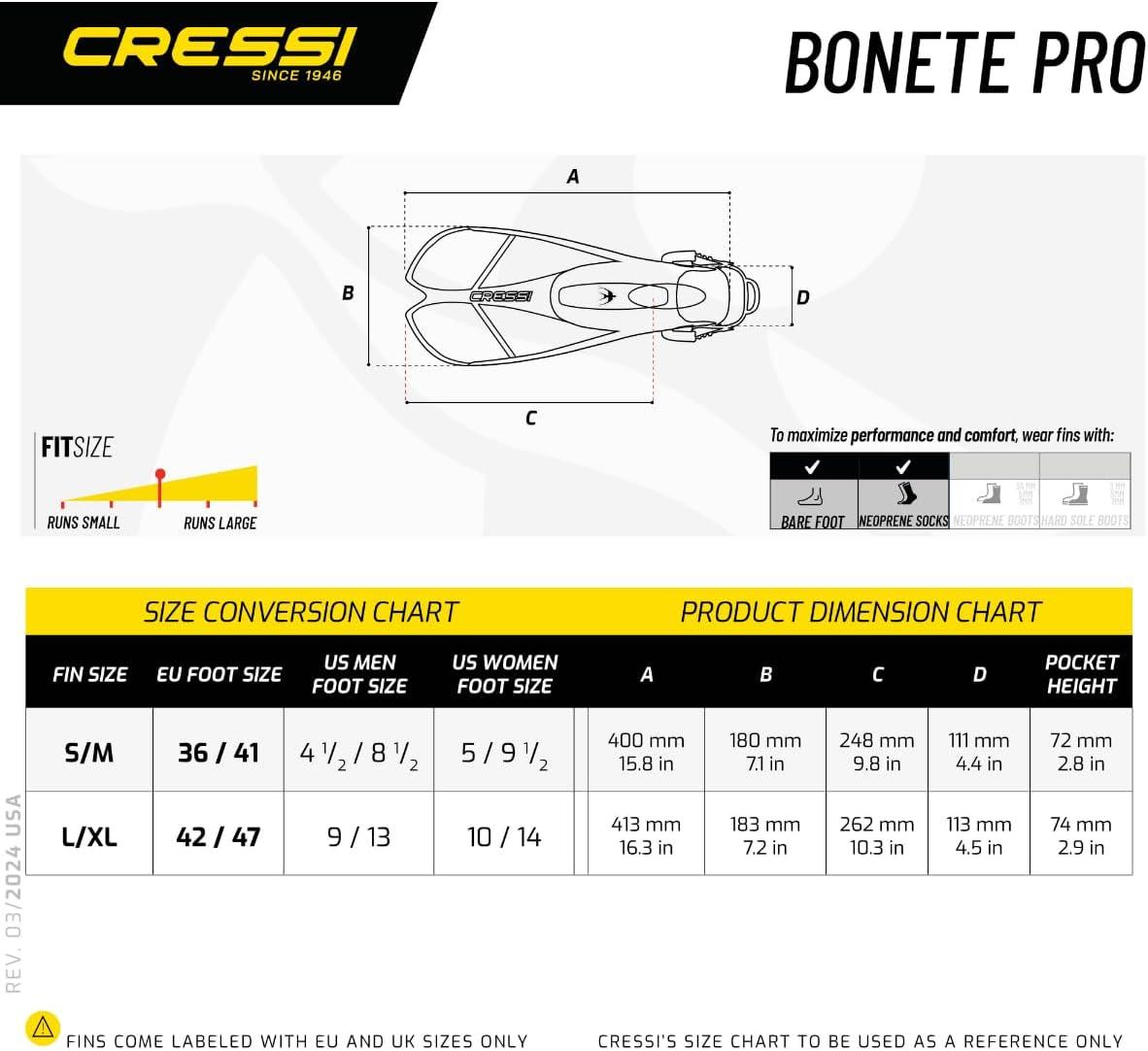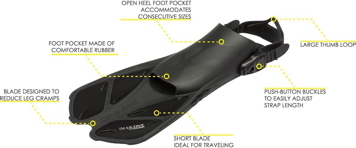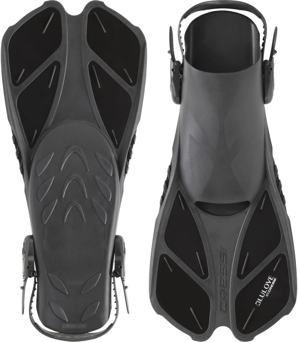 The Cress Bonete fins are short, open-heel fins with adjustable straps. The redesigned buckle system increases the sturdiness and ensures a long lifespan. The fin strap features a large thumb loop for easy donning and doffing. They can also be hung on a hook for drying. The foot pocket is made of a rubber material for comfort and adapts to all feet. This open-foot pocket fin comes with an adjustable strap, which allows it to be shared between different people in a similar foot size-range. The composite design of the blade provides comfortable finning and helps reduce leg cramping.The fins are ideal for travelers due to their compact dimensions and light weight. The Bonete fins are designed by Cressi and made in China. Cressi has been an Italian brand pioneer in scuba diving, snorkeling and swimming equipment since 1946. The product is covered by a 2-year limited warranty.