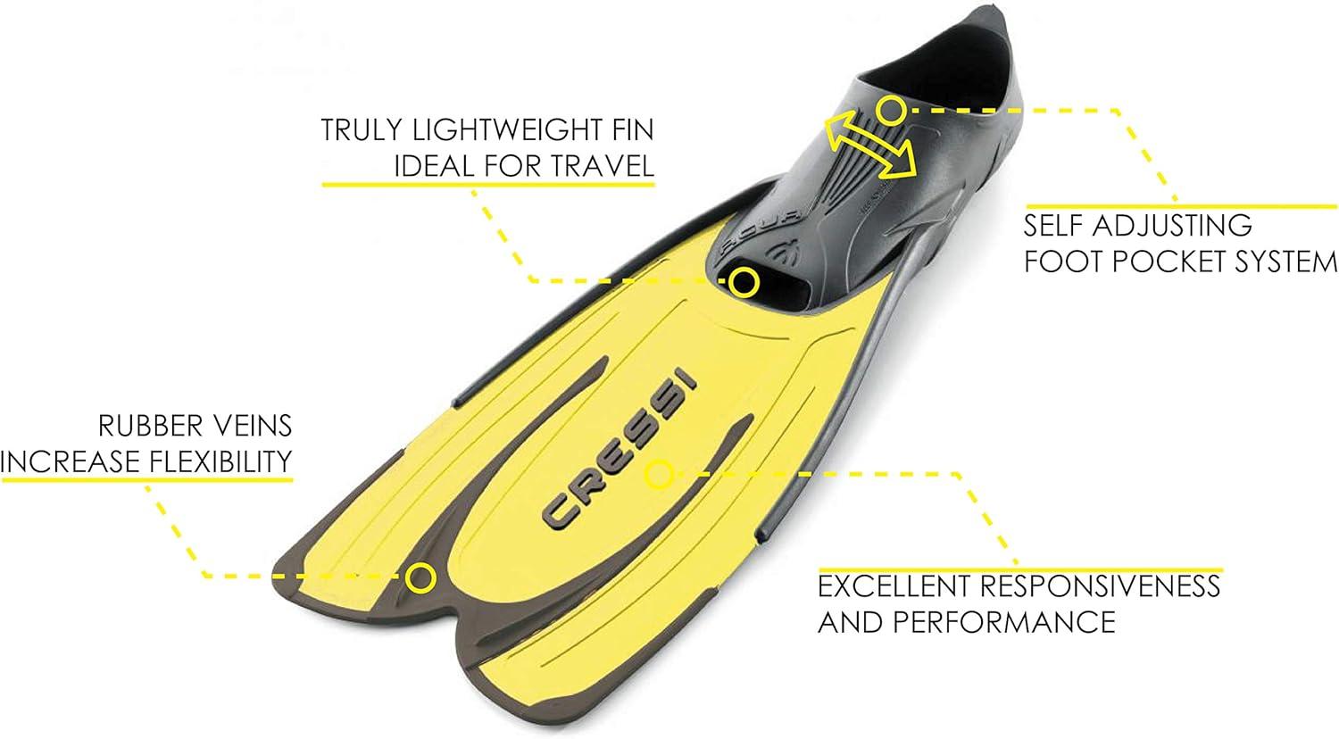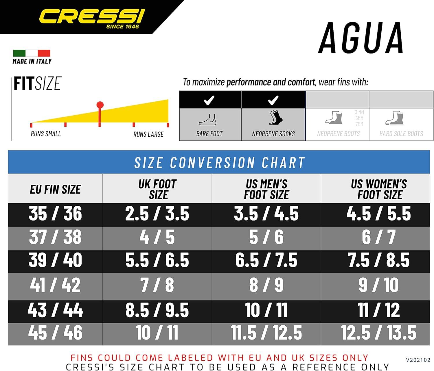 Agua is a very easy fin to use, and doesn't require any special athletic or water-sport abilities, yet it still delivers excellent performance without tiring your feet.Thanks to the latest technology and Cressi's experience in developing these products, we've been able to markedly decrease the weight of this fin compared to others in its category, while still preserving excellent responsiveness.The foot pocket features the original Self Adjusting Foot Pocket system, which thanks to the special softness and elasticity of the blends makes for a consistently soft and adherent fit.