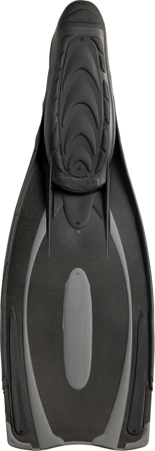 Closed-foot version of the Reaction fins, the buckle-up version has met with full approval from divers.The frame is moulded in three different materials, according to the Cressi patented system that guarantees surprisingly smooth and powerful kicking.The blade is rather long, and has a differentiated thickness – thicker at the front end of the foot, it gets progressively thinner towards the end of the blade.The wide-soled foot is very comfortable and outstandingly enveloping thanks to the extensive use of elastomers.The soles are completely covered in thermo-rubber to give them an excellent grip on boat decks.These fins have been designed not just for swimming and free-diving, but also for scuba diving, where they will surprise you with their fantastic performance.