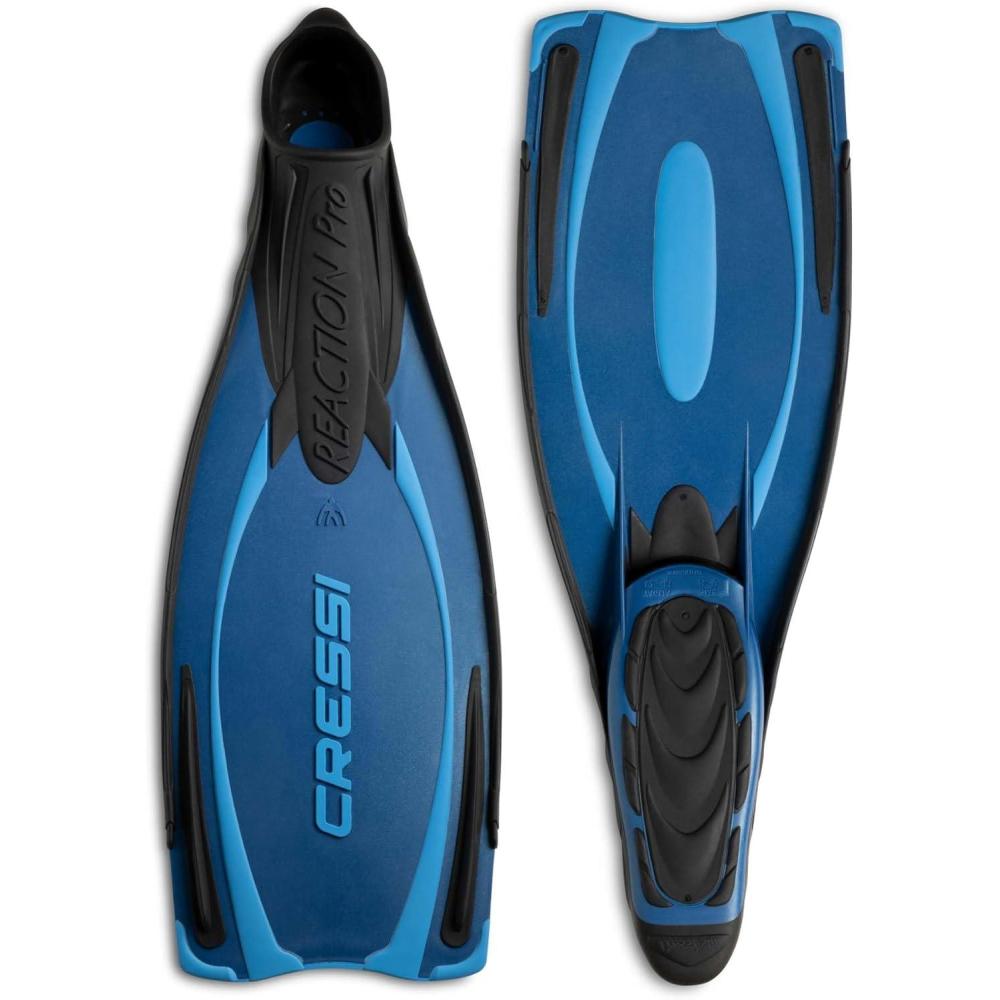 Closed-foot version of the Reaction fins, the buckle-up version has met with full approval from divers.The frame is moulded in three different materials, according to the Cressi patented system that guarantees surprisingly smooth and powerful kicking.The blade is rather long, and has a differentiated thickness – thicker at the front end of the foot, it gets progressively thinner towards the end of the blade.The wide-soled foot is very comfortable and outstandingly enveloping thanks to the extensive use of elastomers.The soles are completely covered in thermo-rubber to give them an excellent grip on boat decks.These fins have been designed not just for swimming and free-diving, but also for scuba diving, where they will surprise you with their fantastic performance.