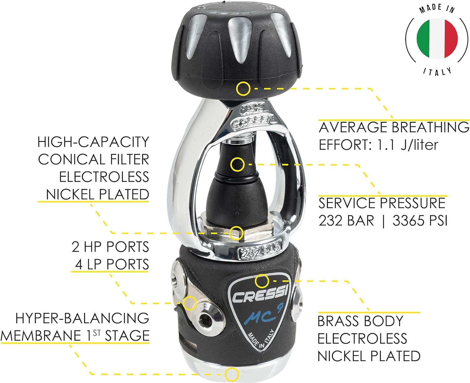 Cressi MC9 Compact Regulator Set: Lightweight regulator with balanced diaphragm 1st stage, compact 2nd stage, and matching Compact Octo. Ensures smooth, reliable breathing—perfect for travel and local diving