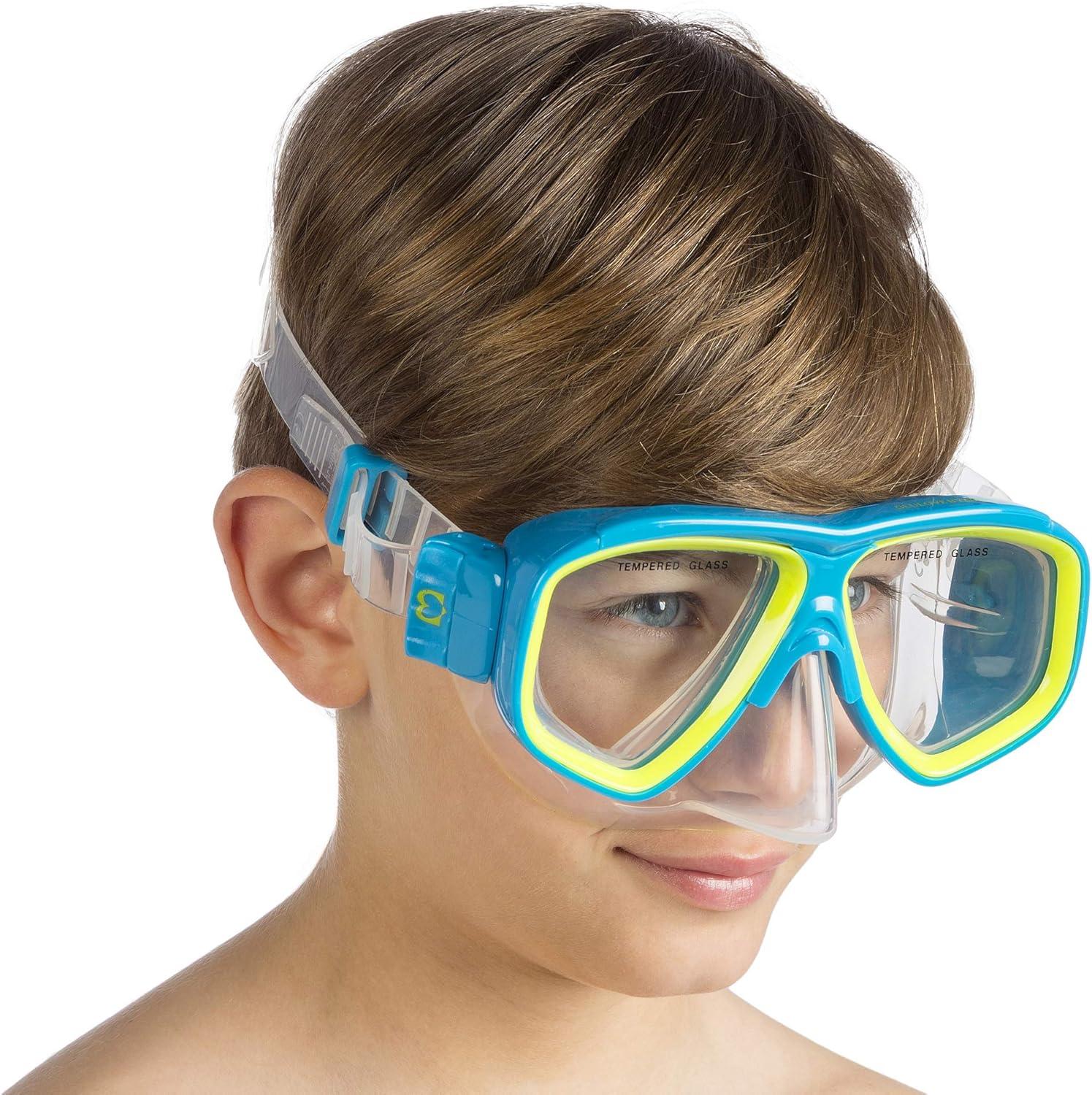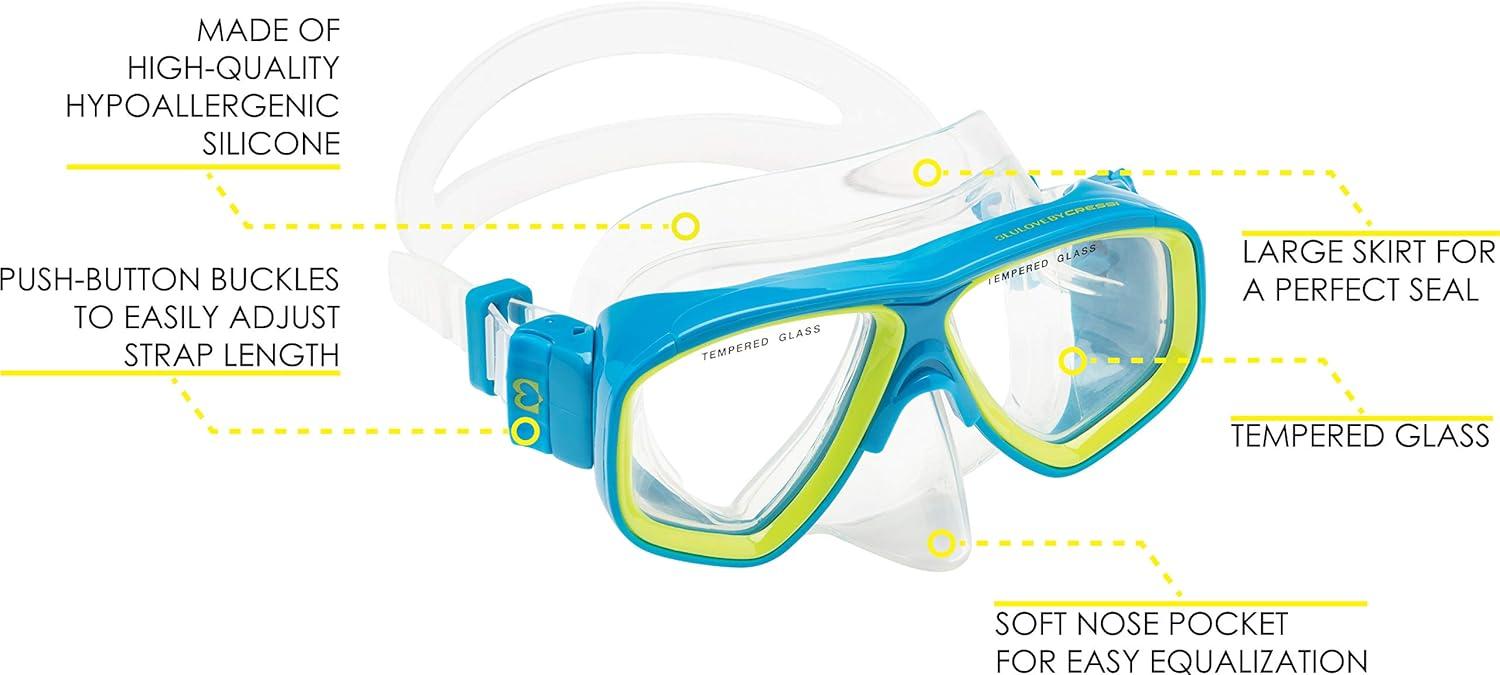 The Brisa is a kids' snorkeling mask with ultra-clear tempered lenses and a skirt made of hypoallergenic soft liquid silicone. Designed indicatively for kids aged from 4 to 10 years old. The frame is constructed from techno-polymer for added strength and durability. The lenses have a shape that allows a wide view of the side and downwards. They are made of tempered glass like the professional scuba diving mask. The double strap allows to the mask in place on the head without being necessary to tighten it too much. Thanks to the buckle design it is very easy to adjust the mask strap length. It is suggested to use an anti-fog solution for cleaning the lenses before use. Safety Warning: do not dive head first into the water while wearing the mask to avoid the possibility of causing any injuries. The lens exceeds the impact test requirement of American National Standard Z86. 11-1985. The Brisa is designed by Cress and made in China. Cress is an Italian brand pioneer in scuba diving, snorkeling and swimming equipment. The product is covered by a 2-year limited .