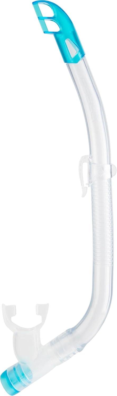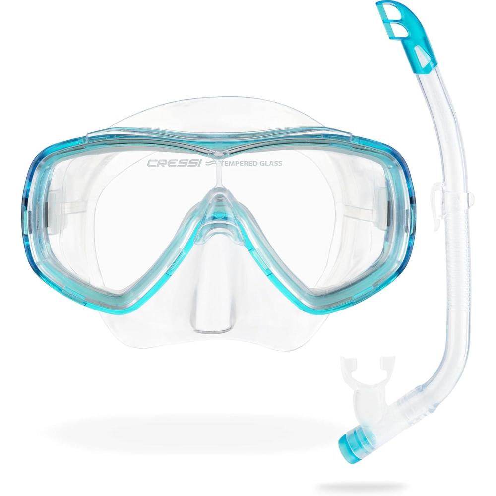 The Ondina & Top is the ideal snorkeling kit for kids that want enjoy discover carefree the underwater marine life. The Ondina mask is the smaller version of the Onda. It's a single tempered lens mask suitable for young people and is designed for snorkeling, swimming and scuba diving. The mask skirt is made from soft hypoallergenic transparent silicone with a double feathered edge that gives an excellent seal on many face types. The Top snorkel is a modern, small semi-dry snorkel, designed specifically for young people. The tube is made from a transparent, contoured and flexible material. The quick-release snorkel keeper system allows height adjustment for comfort. The top end of the tube ends with a semi-dry splash-guard to prevent water from entering the tube even in rough water. The angled 100% high-quality silicone mouthpiece is designed for extreme comfort even during extended use. The Top snorkel has a large internal elliptical one-way purge valve at the bottom for improved drainage. The Ondina and the Top are designed and manufactured in Italy by Cressi, an Italian brand pioneer in scuba diving, snorkeling, and swimming equipment since 1946.