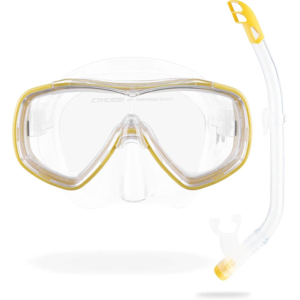 The Ondina & Top is the ideal snorkeling kit for kids that want enjoy discover carefree the underwater marine life. The Ondina mask is the smaller version of the Onda. It's a single tempered lens mask suitable for young people and is designed for snorkeling, swimming and scuba diving. The mask skirt is made from soft hypoallergenic transparent silicone with a double feathered edge that gives an excellent seal on many face types. The Top snorkel is a modern, small semi-dry snorkel, designed specifically for young people. The tube is made from a transparent, contoured and flexible material. The quick-release snorkel keeper system allows height adjustment for comfort. The top end of the tube ends with a semi-dry splash-guard to prevent water from entering the tube even in rough water. The angled 100% high-quality silicone mouthpiece is designed for extreme comfort even during extended use. The Top snorkel has a large internal elliptical one-way purge valve at the bottom for improved drainage. The Ondina and the Top are designed and manufactured in Italy by Cressi, an Italian brand pioneer in scuba diving, snorkeling, and swimming equipment since 1946.