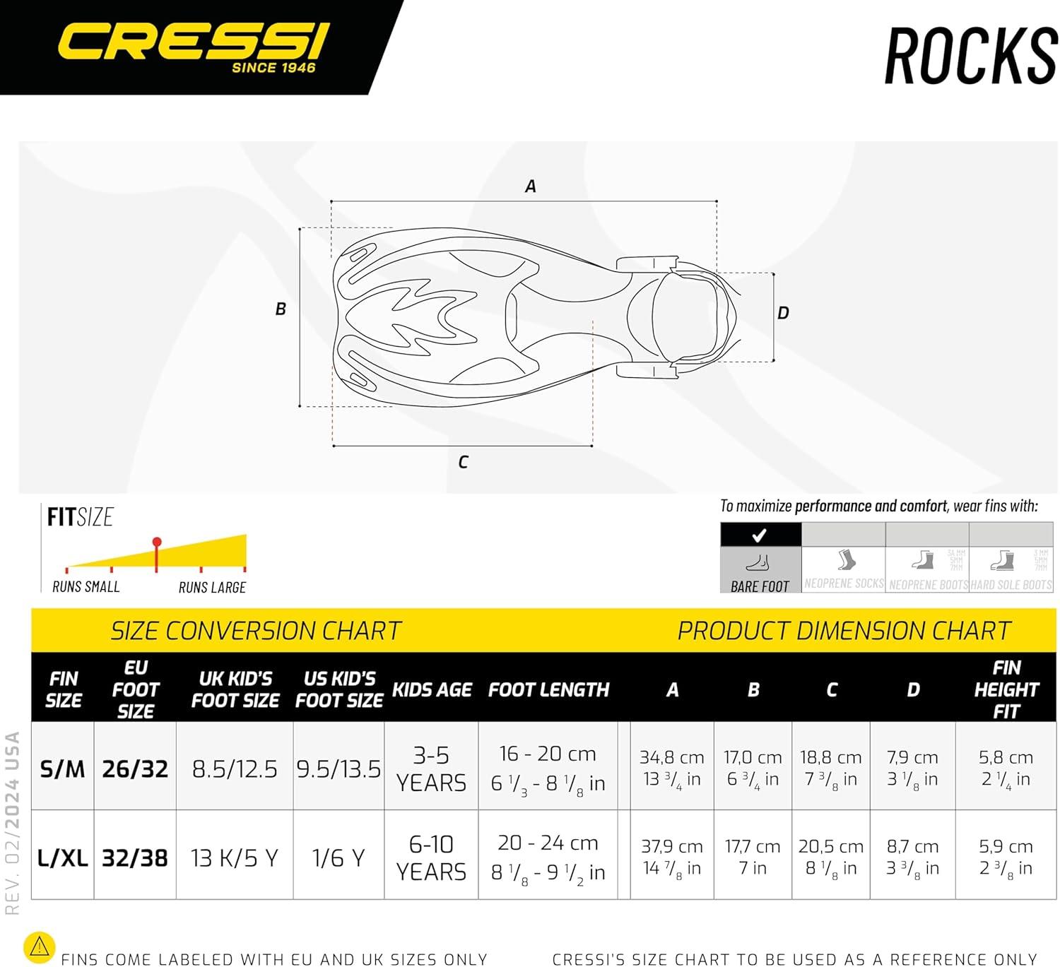 Rocks Kids Set is Cressi's answer to the price conscious parents who need reliable snorkel equipment for their kids for vacation use. We offer with this line the solution for adventurous kids who need decent quality for all day use in the pool or in the ocean. The Rocks Mask lenses are made from tempered glass and the dual window design provides excellent and a wide field of vision. Mask has an easy-to-reach nose pocket for ear equalization. The snorkel features the splash guard designed to prevent splashed surface water from entering inside the snorkel barrel. The soft and replaceable mouthpiece, in combination with the flex tube section, allow for hours of comfortable snorkeling fun. The one-way purge valve below the mouthpiece allows and water in the tube to drain-rapidly. The snorkel comes complete with an easy-to-use snorkel keeper for attachment to the mask strap. Soft and comfortable vented open heel foot pocket with easy to adjust buckles designed to follow the kid’s growth. The strap has a Quick-Release Easy-Adjust buckle with large-thumb-loop for easy donning and doffing. Dual composite vented blades provide excellent power and energy saving efficiency. The product is designed in Italy by Cressi and made in China. Cressi has been a brand pioneer in scuba diving, snorkeling, and swimming equipment since 1946. The product is covered by a 2-year limited warranty.