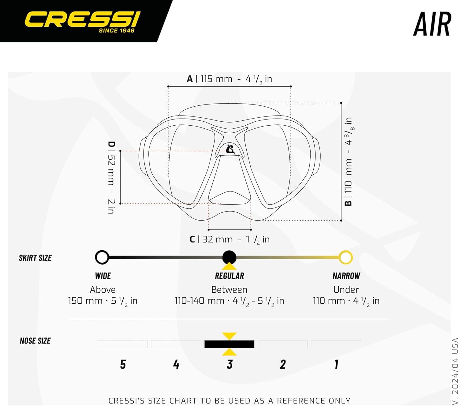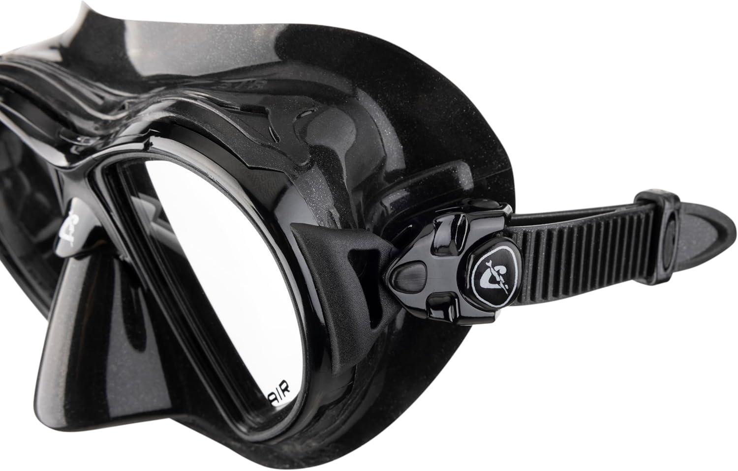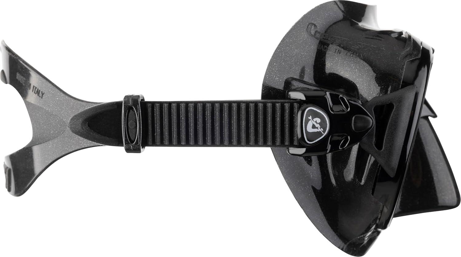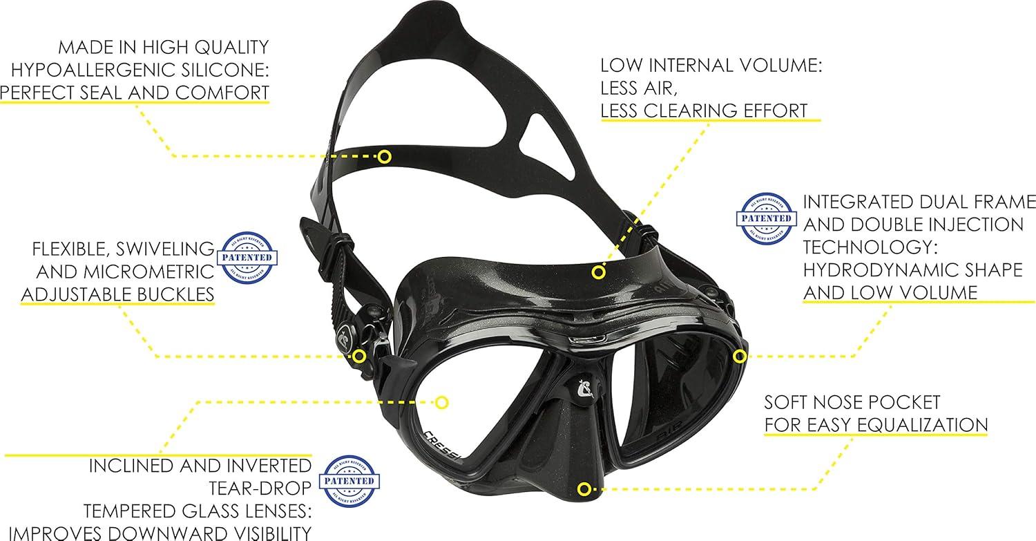 This revolutionary mask is made from black hypoallergenic high seal soft silicone rubber, a new material that offers extraordinary and unprecedented comfort and fit. The mask rests on the face with this unprecedented silicone rubber and does not leave any marks on the skin, even after extended use. So, if you're tired of your mask gives you ring-around the eyeballs, this mask is for you. Naturally, to obtain such a result the entire structure of the skirt is differentiated, with internal ribs that stiffen the parts of the mask that are most stressed.Mask gives an exceptionally wide field of view. The raked dual tempered glass lenses, with their inverted teardrop shape (Cressi Patent) rest as close to the eyes as possible, so that the already extraordinary field of view is increased by 25% over the Cressi Matrix Mask. The mask strap uses the exclusive patented Cressi system of double injecting of a flexible elastomer on a rigid element which allows the buckles of the strap to mounted not on the skirt structure as done with other masks, but on the Indestructible elastic element that tilt on a vertical plane and can be completely bent sideways up to 180-degree curve. The silicone mask strap is a wide split strap for even dispersion for increased fit and comfort.The thickness of the mask frame has been reduced to such an extent that it is practically Invisible when the mask is being worn. The mask skirt is a double feathered edge design and has an easy-to-reach on