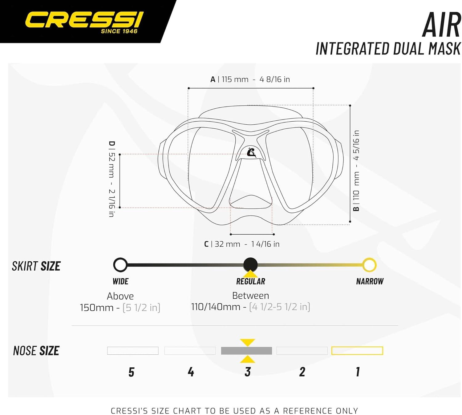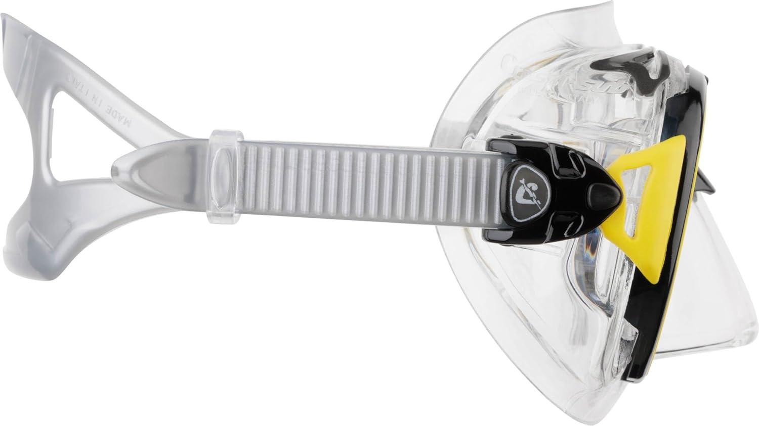 This revolutionary mask is made from black hypoallergenic high seal soft silicone rubber, a new material that offers extraordinary and unprecedented comfort and fit. The mask rests on the face with this unprecedented silicone rubber and does not leave any marks on the skin, even after extended use. So, if you're tired of your mask gives you ring-around the eyeballs, this mask is for you. Naturally, to obtain such a result the entire structure of the skirt is differentiated, with internal ribs that stiffen the parts of the mask that are most stressed.Mask gives an exceptionally wide field of view. The raked dual tempered glass lenses, with their inverted teardrop shape (Cressi Patent) rest as close to the eyes as possible, so that the already extraordinary field of view is increased by 25% over the Cressi Matrix Mask. The mask strap uses the exclusive patented Cressi system of double injecting of a flexible elastomer on a rigid element which allows the buckles of the strap to mounted not on the skirt structure as done with other masks, but on the Indestructible elastic element that tilt on a vertical plane and can be completely bent sideways up to 180-degree curve. The silicone mask strap is a wide split strap for even dispersion for increased fit and comfort.The thickness of the mask frame has been reduced to such an extent that it is practically Invisible when the mask is being worn. The mask skirt is a double feathered edge design and has an easy-to-reach on