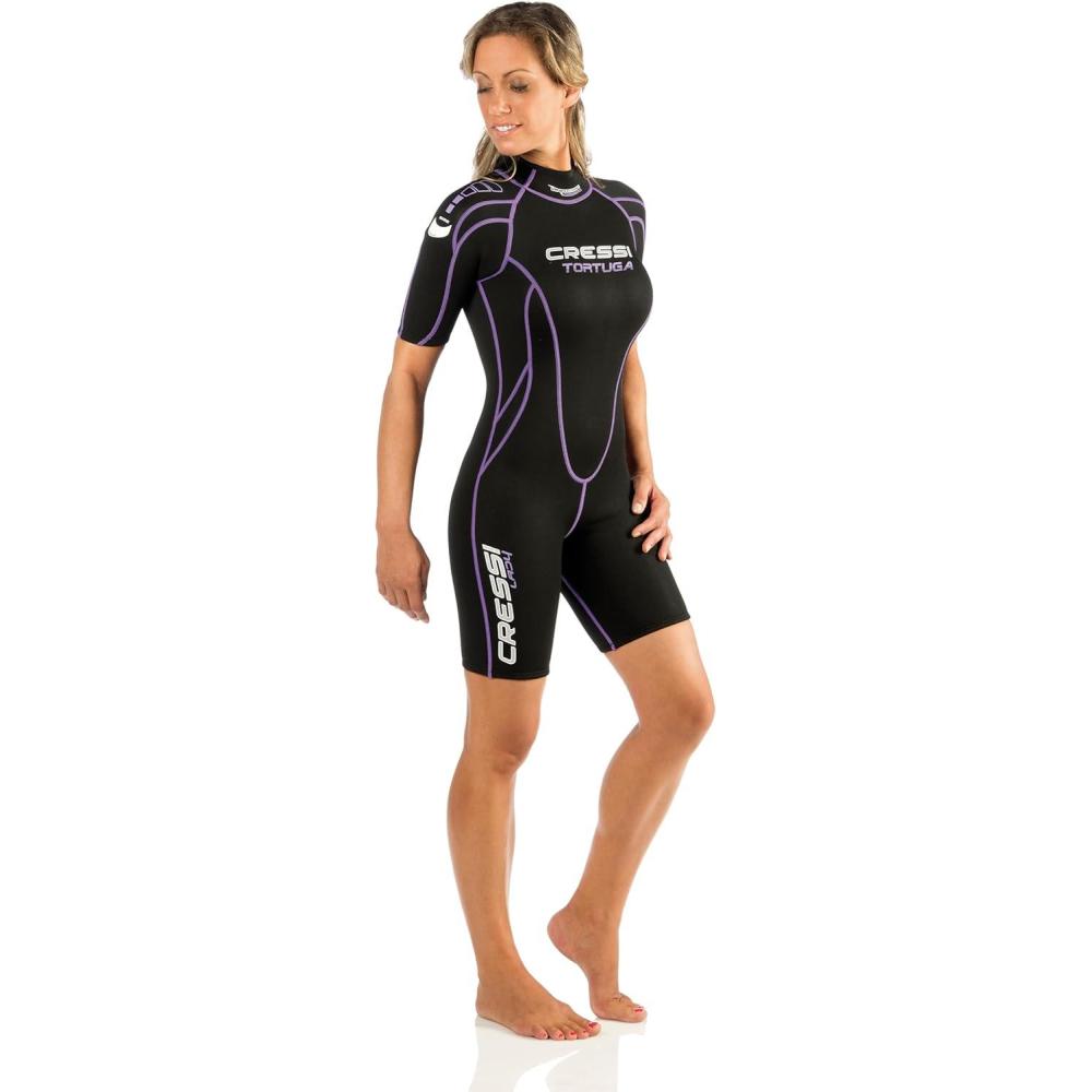 One-piece shorty wetsuit ideal for tropical waters and any kind of water activities, such as snorkeling, surfing, kitesurfing, kayaking, and scuba diving.