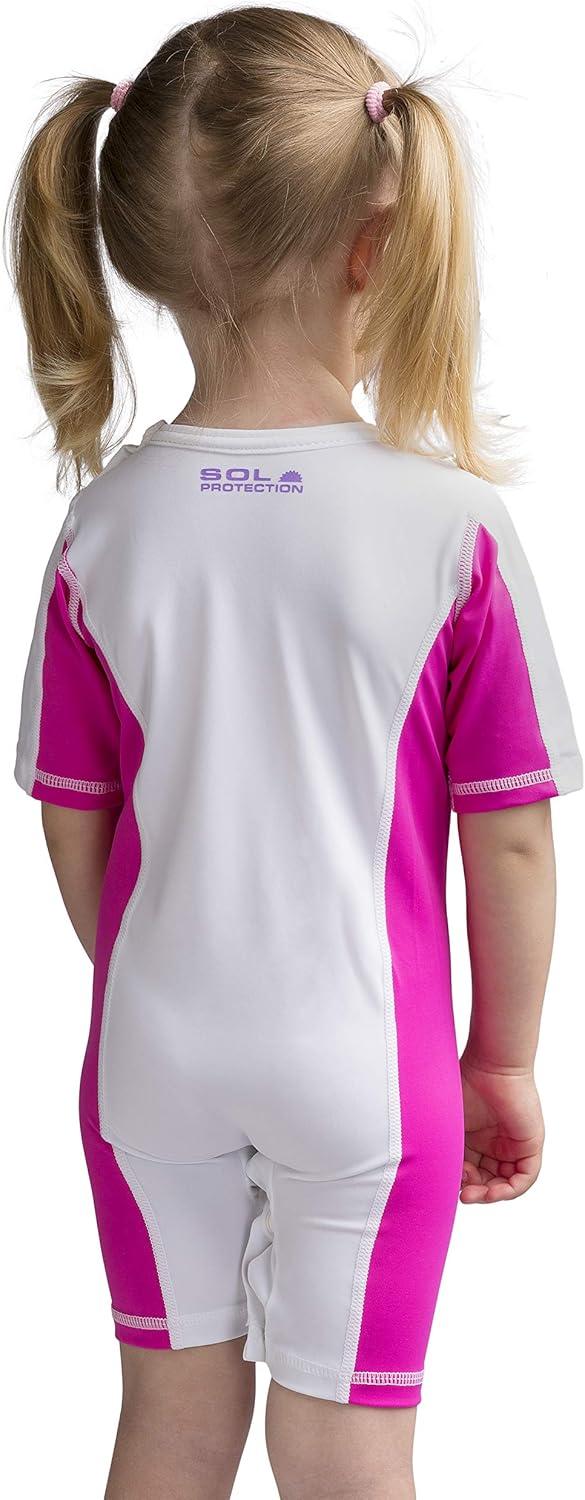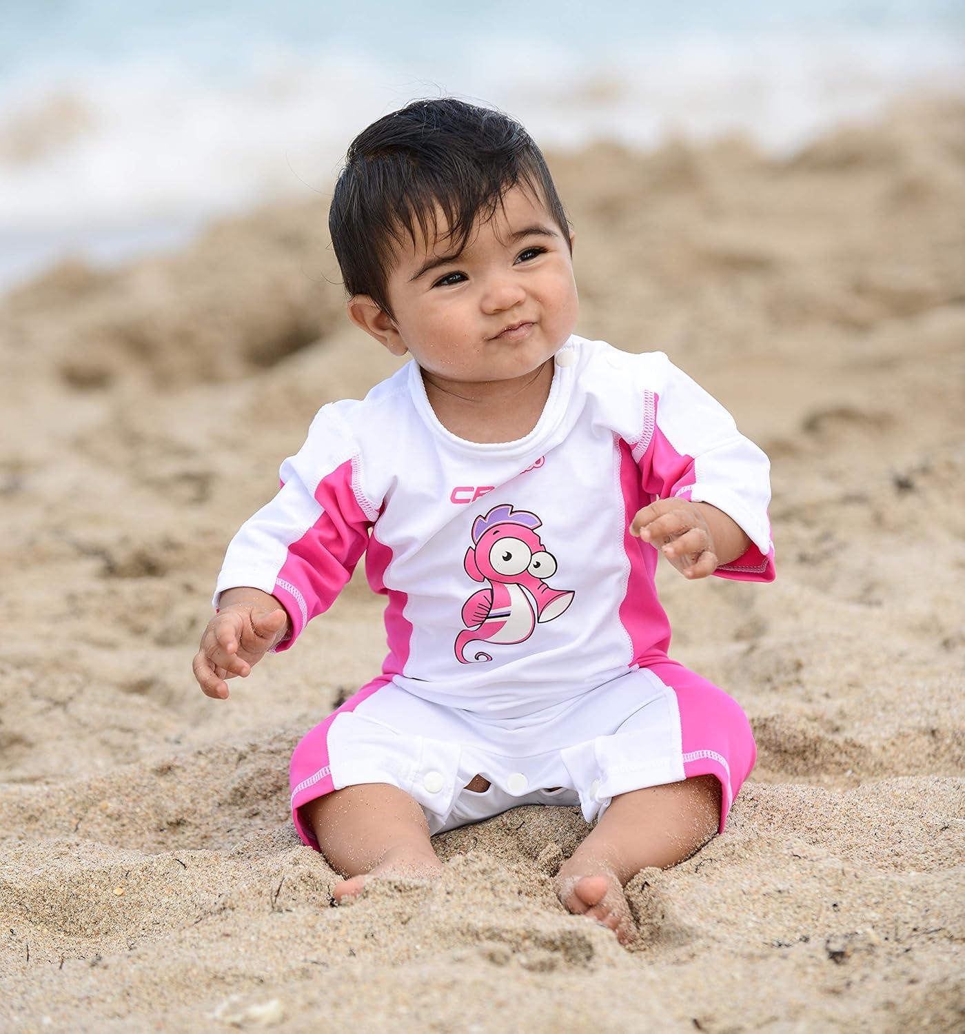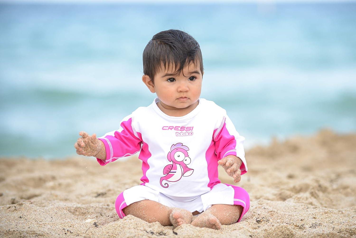 The Babaloo Beachwear is perfect for protect babies’ skin from the sun and sand during beach time. It is a mono-piece swimsuit with short sleeves that allows the baby to play in the water while being protected from the sun and the wind. Although the fabric is thin, and tends to be semi-transparent when wet, it does provide a good protection against the dangerous UVA and UVB rays. The baby can move freely thanks the comfortable design and lightness. The rash guards doesn’t irritate the sink while swimming and can protect against insect and jellyfish. It features the snap closures for quick and easy changes of the diaper. The rash guard is easy to clean and dries quickly. The product is covered by a 2-year limited warranty.
